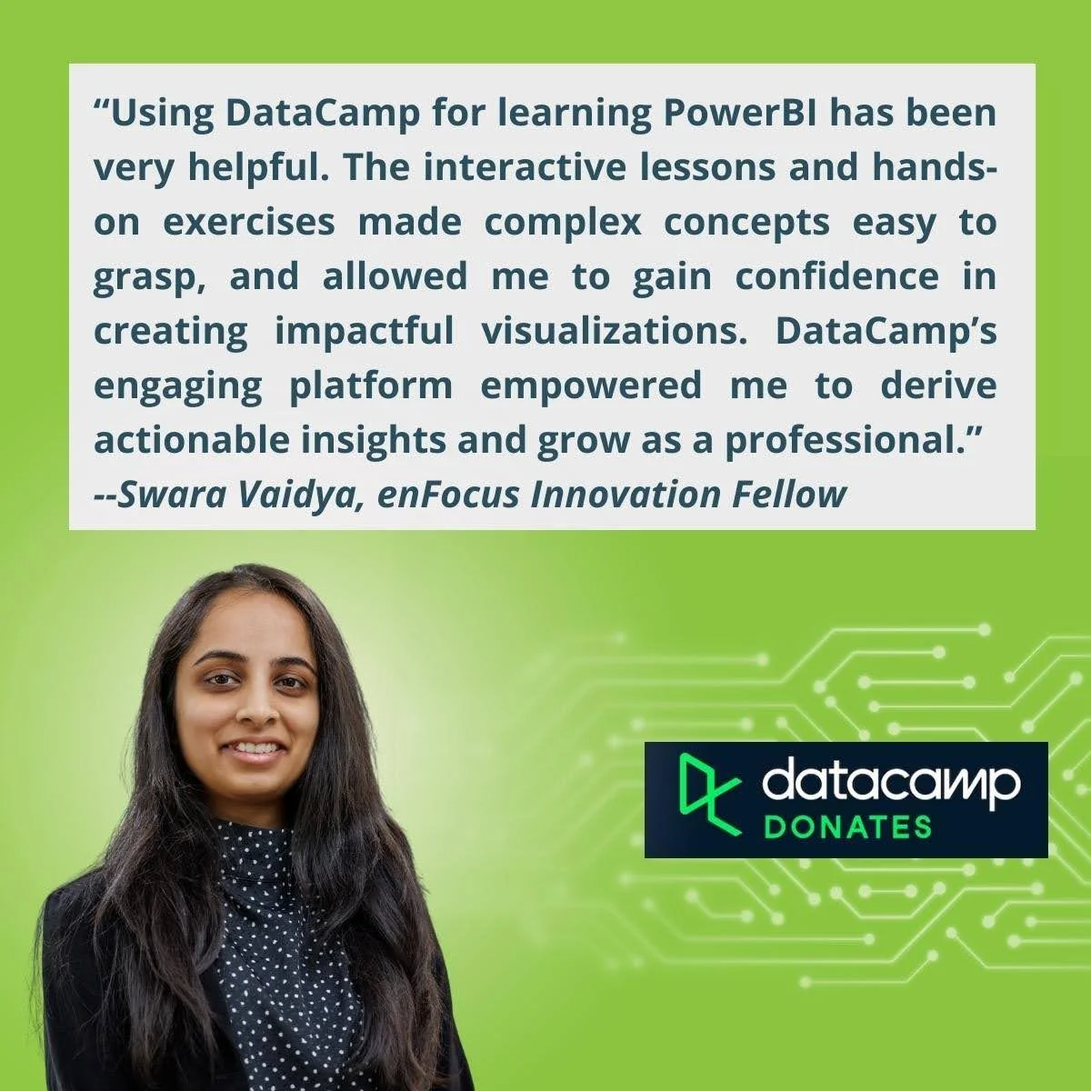 One of the ways we’re strengthening our learning ecosystem is through our partnership with DataCamp Donates. Through this program, team members gain access to world-class training in data analytics, visualization, and advanced modeling. By pairing this resource with project experience, Fellows not only become fluent in tools like Google Sheets, Power BI, and Python—they learn how to translate data into insights that drive impact.